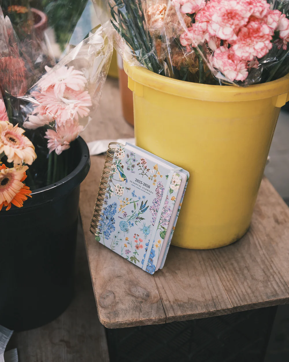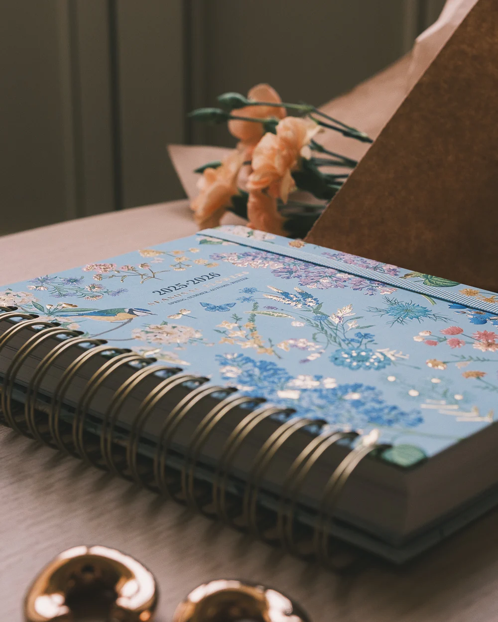 Agenda Blue Garden azul con ilustraciones florales y detalles dorados. Cuenta con una banda elástica, y en su interior podemos encontrar un resumen anual, planificador mensual y una planificación diaria. También encontramos dos páginas de pegatinas para darle un toque más personal a la agenda, un planificador de gastos y un seguidor de hábitos.