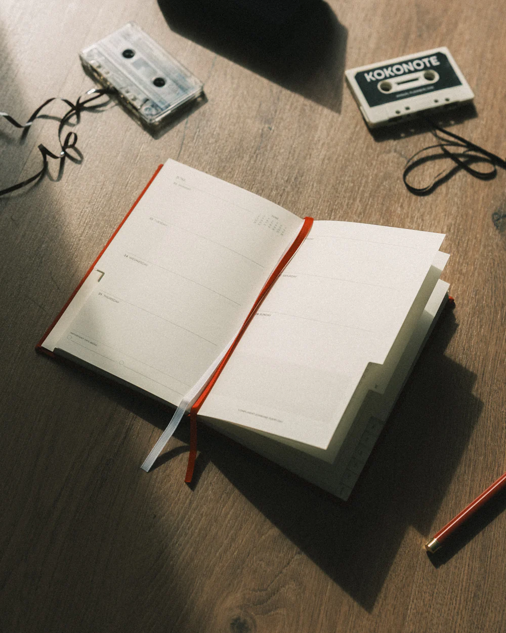 Agenda A5 minimalista con tapa en tela burdeos. Interior pensado para organización mensual y semanal.