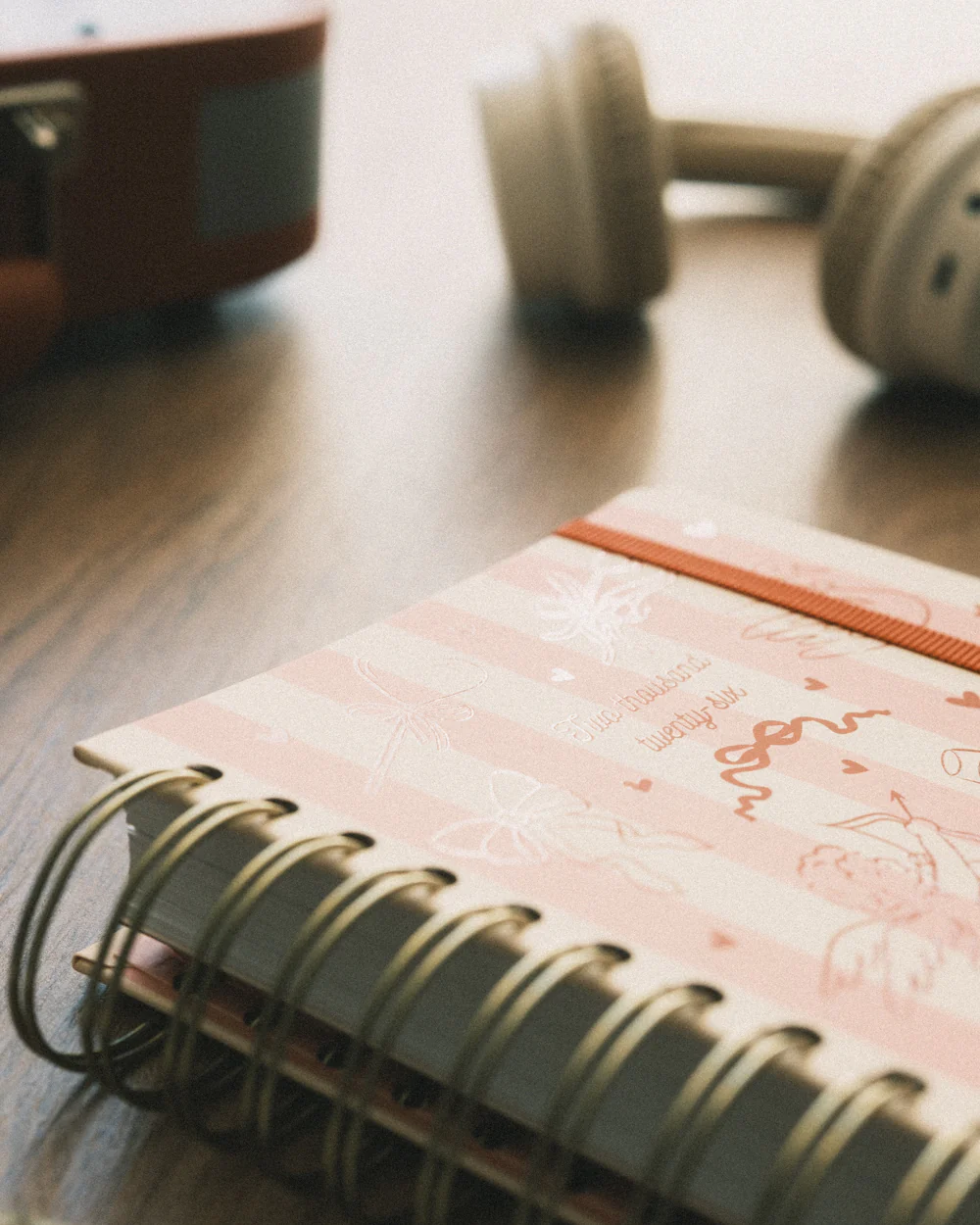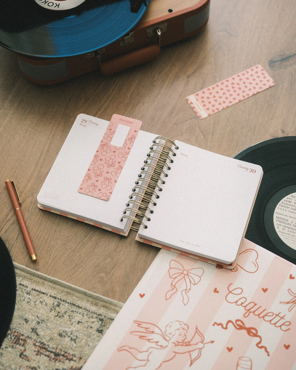 Agenda Coquette en color rosa con ilustraciones vintage y detalles dorados. Cuenta con una banda elástica, y en su interior podemos encontrar un resumen anual, planificador mensual y una planificación diaria. También encontramos dos páginas de pegatinas para darle un toque más personal a la agenda, un planificador de gastos y un seguidor de hábitos.